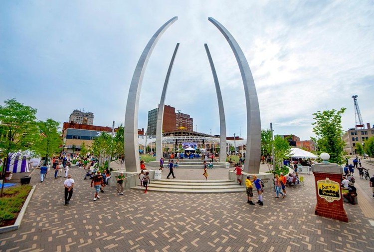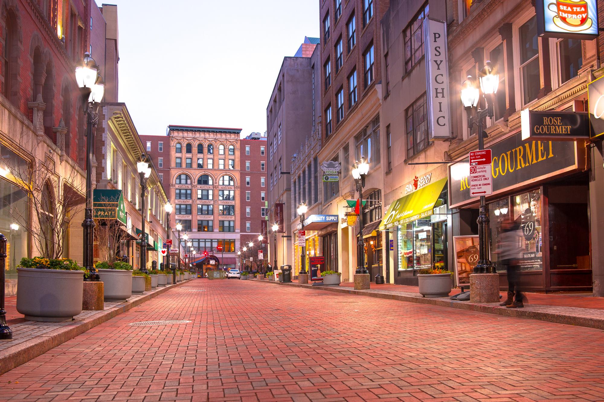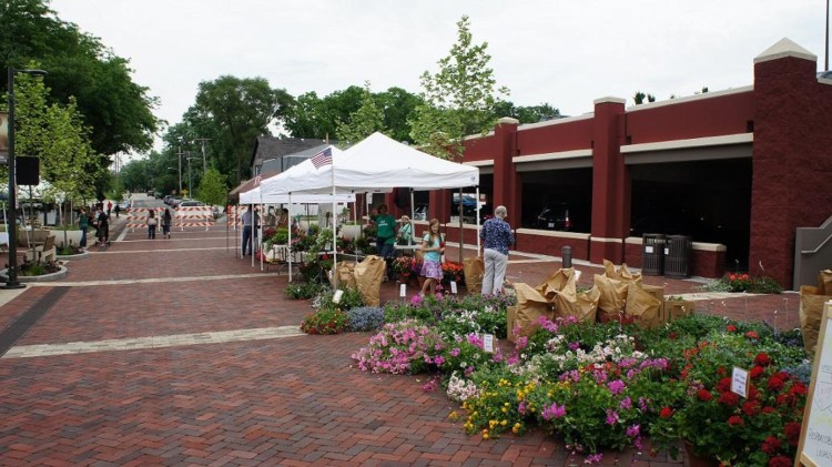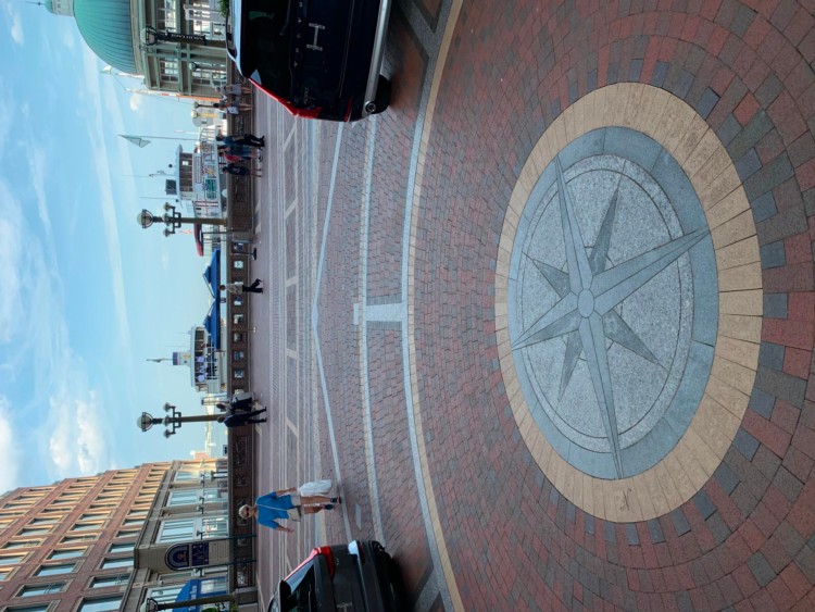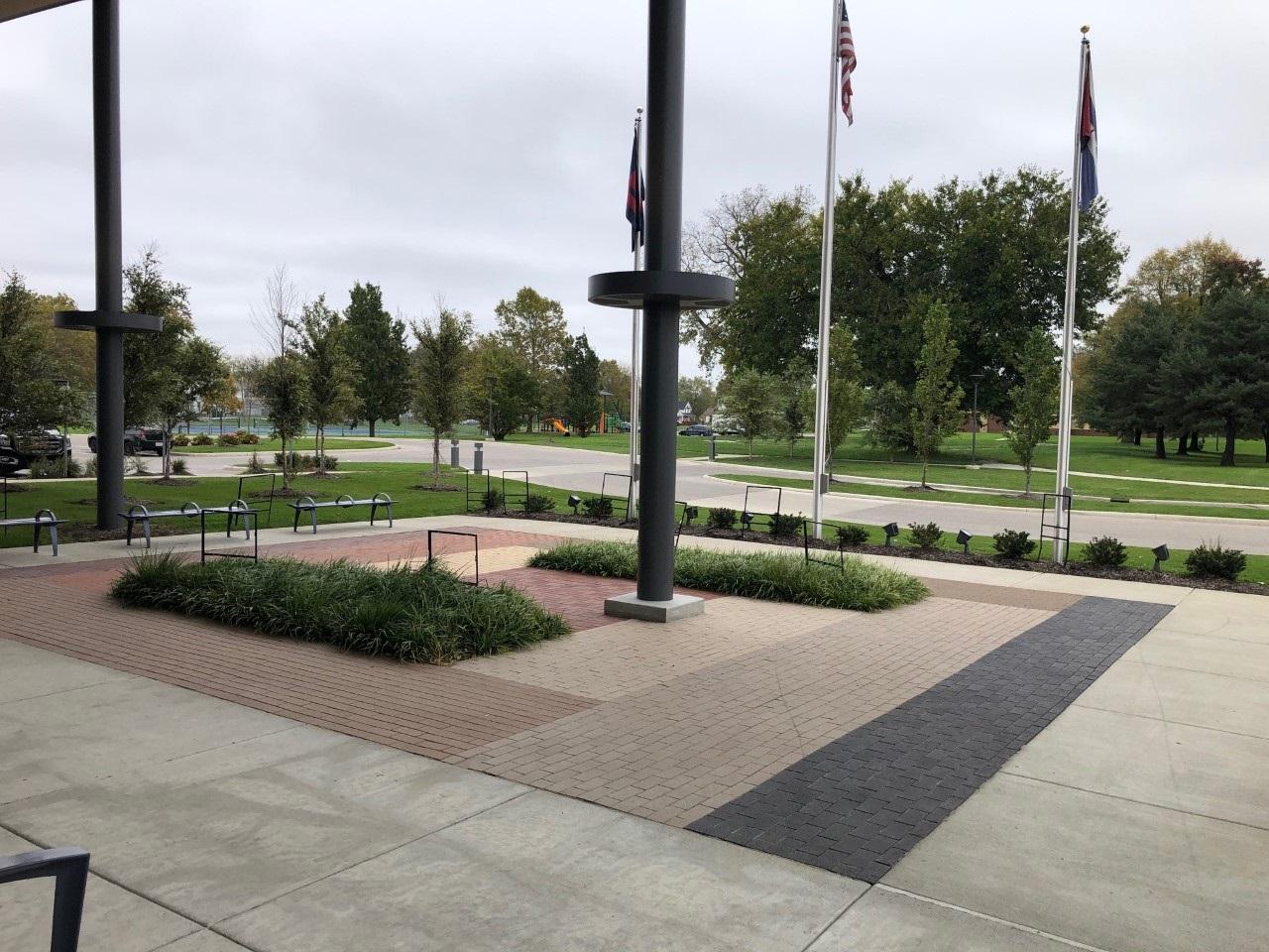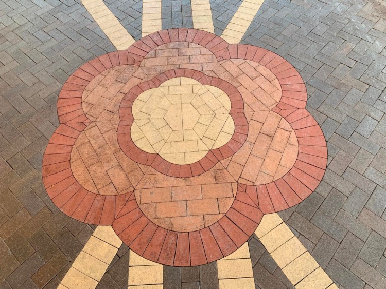 A brick walkway bordered by flowers